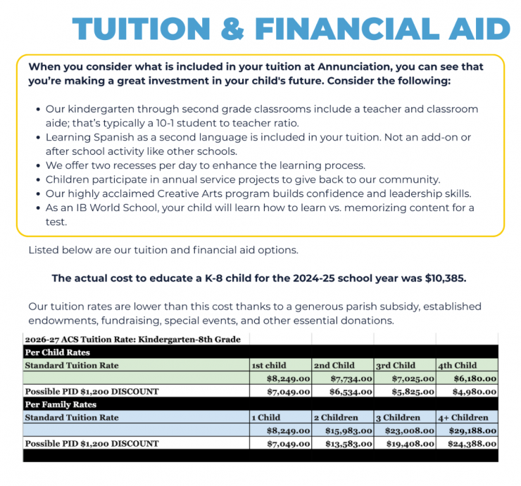 The Aim Higher Scholarship is awarded to students from families seeking tuition assistance. The scholarship follows students from Kindergarten through 8th grade and to other Catholic schools.