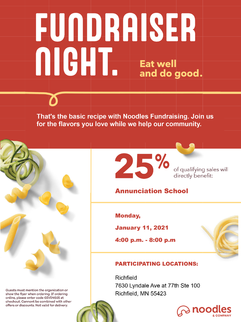 For online and Noodles Rewards app orders, you can apply the coupon code, “GIVING25” in the Coupon Code line at checkout. Ordering online is quick and easy and allows you to skip the line by grabbing your meal at our Quick Pick-Up station or where pick up windows are present. This is a great option for guests who prefer to dine at home or on-the-go but still want to support our school.