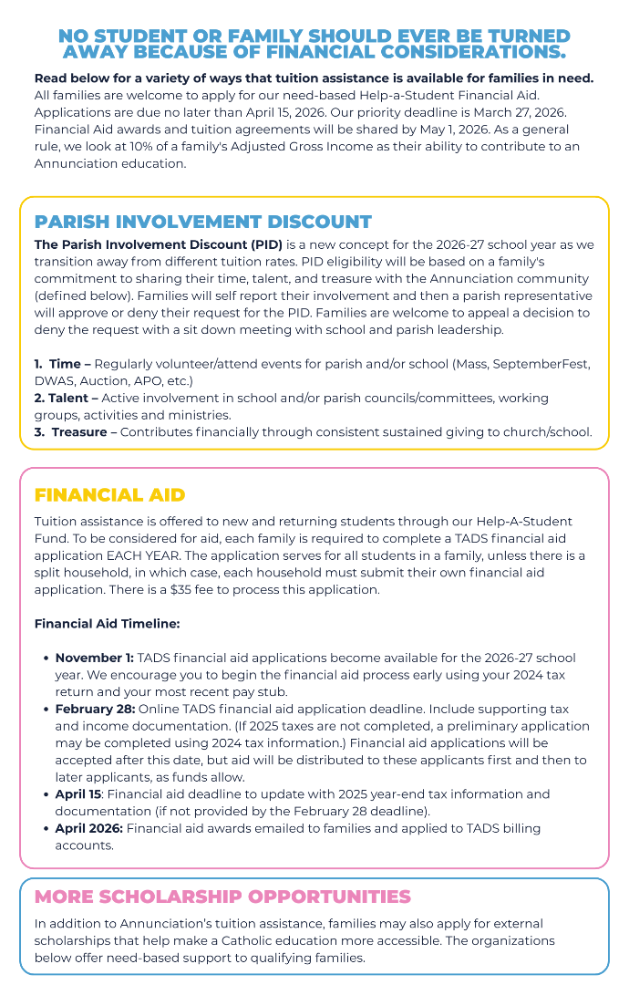 The Aim Higher Scholarship is awarded to students from families seeking tuition assistance. The scholarship follows students from Kindergarten through 8th grade and to other Catholic schools.